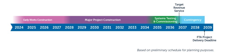 Construction of VTA’s BSVII Project can be segmented into three high-level stages: Early Works Construction, Major Project Construction, and systems testing and commissioning. These stages are discussed in more detail below. The Construction Activities and Sequence graphic below illustrates the various construction activities typical in the three described stages and the corresponding schedule leading up to the target passenger service date by 2037.Â